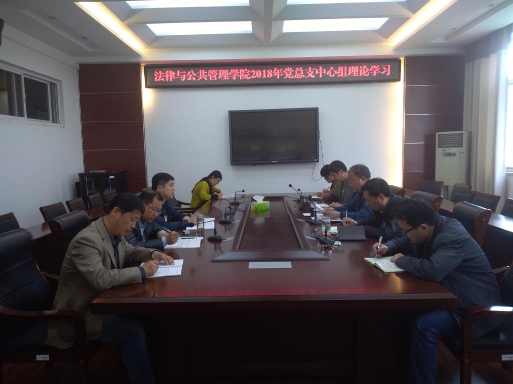 4月28日下午,法律与公共管理在文渊楼216会议室举行党总支中心组2018年第二专题理论学习,法律与公共管理学院全体院领导、支部书记参加,学习会由院党总支书记朱国良主持。