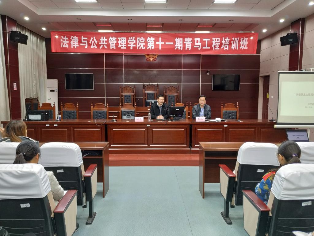 11月14日晚7时,法律与公共管理学院在模拟法庭举办第十一期青马工程培训,邀请马克思主义学院党总支书记张学武讲解中美贸易争端。