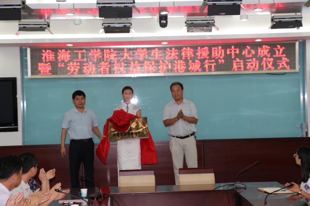 随后,校团委书记朱国军宣读成立淮海工学院大学生法律援助中心的决定,市法律援助中心主任张龙江与法学院党总支副书记、副院长黄金虎签订共建淮海工学院大学生法律中心协议。市司法局副局长薛玉江、法学院党总支书记朱国良为淮海工学院大学生法律援助中心揭牌。
