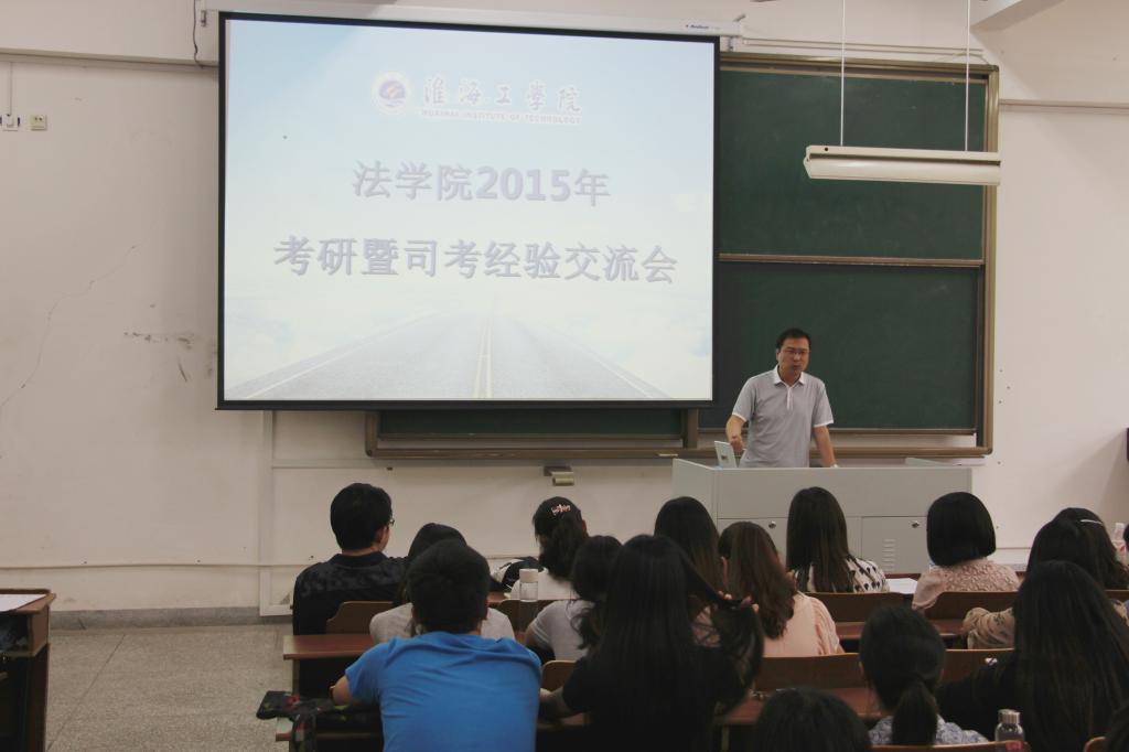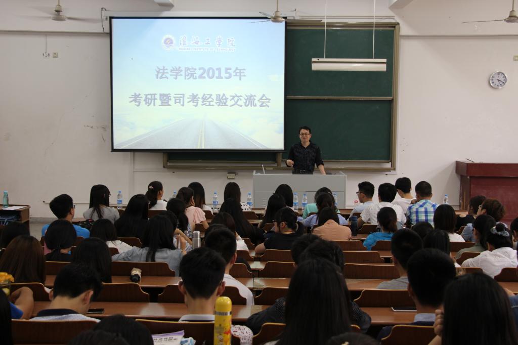 6月1日下午,法学院在A104教室举办2015年考研暨司考经验交流会。法学院党委副书记、副院长黄金虎、副院长魏范青和法学院部分考取研究生、通过司法考试的优秀学生代表出席会议。法学院2012级全体同学和部分大一、大二学生参加了交流会。交流会由黄金虎老师主持。