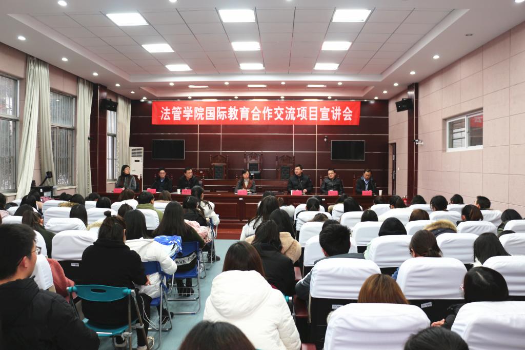 为加强学生国际化培养工作,3月7日下午,法律与公共管理学院在文渊楼模拟法庭会议室举行国际教育合作交流项目宣讲会。校国际交流与合作处处长徐岚,法律与公共管理学院院长陈兴发,学院党总支副书记、副院长黄金虎,副院长魏范青,赵科学与吴建国两位博士和辅导员蒋莹莹出席会议,全院通过大学英语六级及其他有出国意向的同学共100多人参加了会议,宣讲会由黄金虎主持。