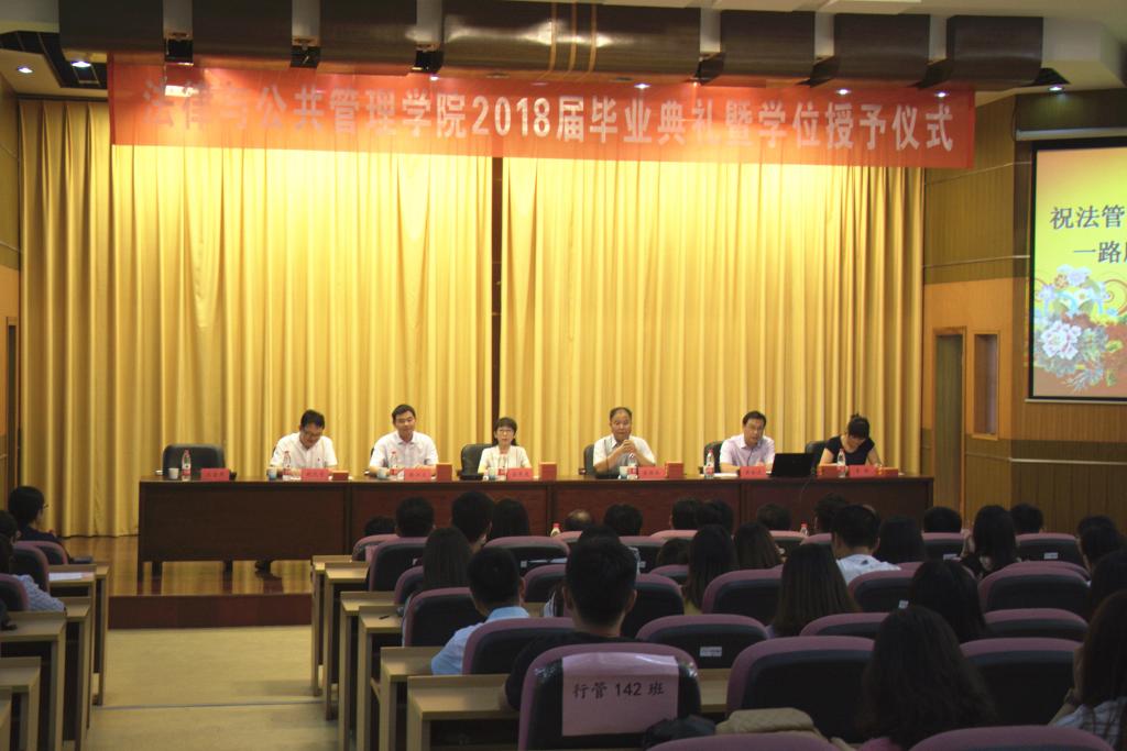 6月23日上午,法律与公共管理学院在文博楼报告厅举行2018届毕业典礼暨学位授予仪式。校党委常委、副校长金芙蓉,法律与公共管理学院党政领导朱国良、陈兴发、黄金虎、魏范青、李敏,各系正副主任、全体辅导员、毕业班班主任、部分老师和2018届全体毕业生参加典礼及仪式,典礼由院党总支副书记、副院长黄金虎主持。