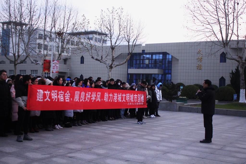 为创建文明宿舍,建设优良学风,助力连云港建设成为全国文明城市,12月10日清晨,法律与公共管理学院在主楼广场前举行“建文明宿舍,展优良学风,助力港城文明城市创建”主题升旗仪式。院党总支书记朱国良,党总支副书记、副院长黄金虎,团委书记崔家新,辅导员蒋莹莹,班主任老师和15、16、17级全体学生参加了升旗仪式。