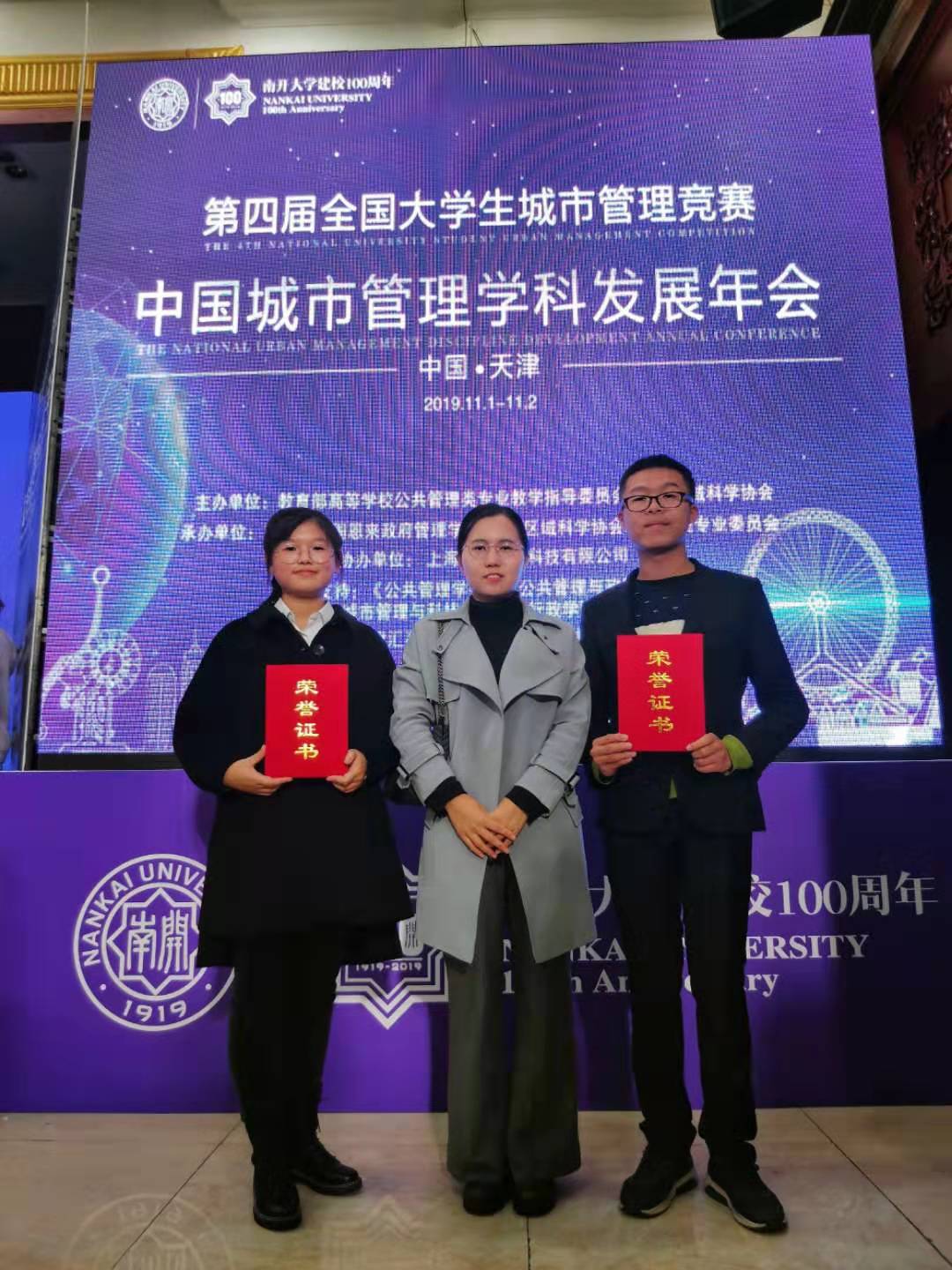 11月3日,2019年中国城市管理学科发展年会暨第四届全国大学生城市管理竞赛在天津落下帷幕。我校共两支团队参与决赛并分别获得三等奖,获奖作品为《“三生空间”理念下滨海城市土地利用转型及其生态环境效应研究--以连云港为例》以及《健康中国背景下全民健身路径的可持续发展探究--以连云港市为例》,分别由付永虎博士指导土地资源管理专业学生胡晗、封艳、耿灿团队以及颜金博士指导行政管理专业学生封筱倩、范丽婷、王颖团队完成,郭赟老师带队老师参赛。