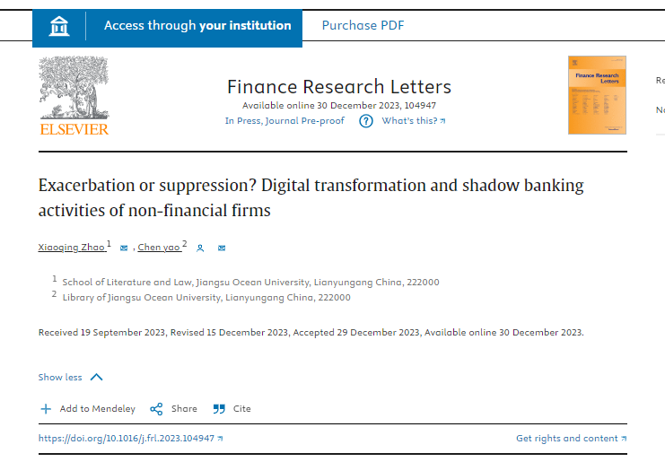 近日,我院教师赵晓庆(第一作者)和图书馆姚琛馆员(通讯作者)合作的学术论文《Exacerbation or suppression? Digital transformation and shadow banking activities of non-financial firms》(《加剧还是抑制?数字化转型与非金融企业的影子银行活动》)在SSCI一区期刊《Finance Research Letters》发表。