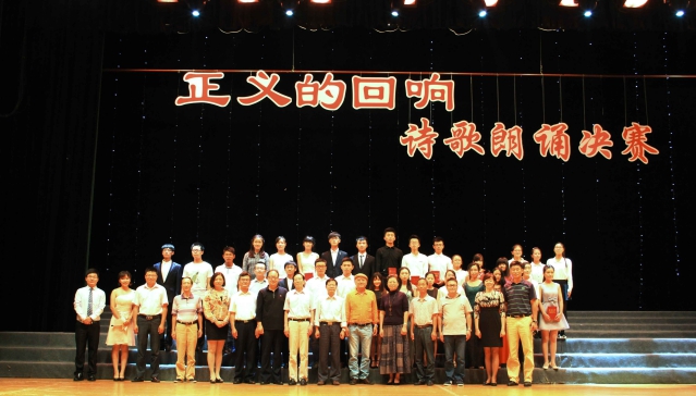 9月16日晚,淮海工学院纪念中国人民抗日战争胜利暨世界反法西斯战争胜利70周年诗歌朗诵比赛在校大礼堂成功举办。本次比赛由教务处、宣传部、学生处和团委主办,文学院和市文联、市朗诵协会联合承办。教务处处长李纪明、学生处处长汤洪涛、校团委书记朱国军和连云港市朗诵协会副主席、文学院肖振宇教授与校外专家共同担任了比赛评委。文学院党政领导马恒民、吴明忠、芦海英、田德勇作为嘉宾出席了本场比赛。来自各学院的数十名选手用充满激情的诗朗诵表达当代大学生铭记历史、缅怀先烈、珍爱和平、开创未来的家国情怀。