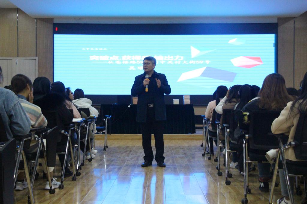 首先,吴院长讲述了我校的校史、文学院的院史和自己的前半生,并向同学们介绍了文学院中文系的历任领导。1986年11月,庄长元教授来到连云港帮助学校制定中文系教学计划及其他办学事宜。1987年,秦慧珠任中文系副主任。1988年,鲍善本任中文系主任。此外,吴院长还向同学们介绍了文学院的杰出校友,市总工会党组书记丁维杰,江苏省粮食局副局长董淑广,连云港市高新区主任李莉,江苏盈科董事长李海等多名优秀校友。吴院长说:“学校培育出的优秀人才,他们用知识和才华报效了国家,回馈了社会,是我们永远的骄傲。”同时院长对同学们也寄予厚望,希望大家努力学习,找到突破点,取得获得感和输出力。