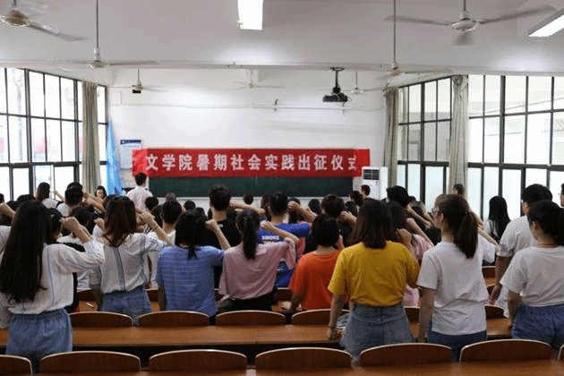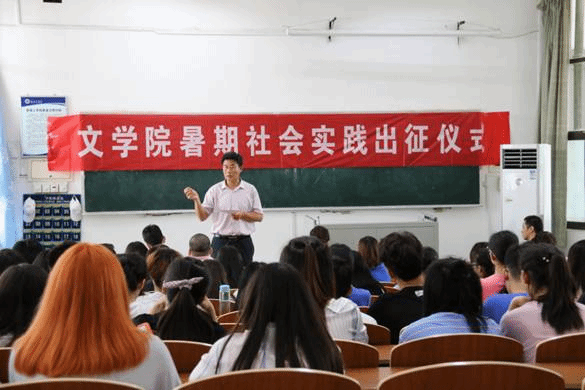 7月5日下午4时,文学院2018年暑期社会实践出征仪式在文博楼104教室顺利举行。文学院党委副书记田德勇、全体辅导员、暑期社会实践全体团队成员参加会议。