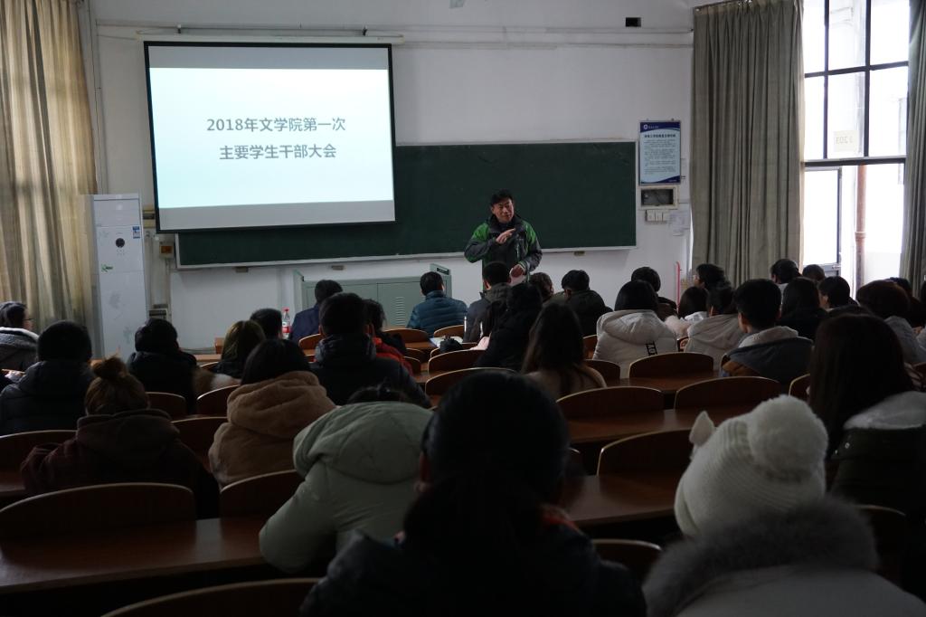 3月7日午4时30分,我院第一次主要学生干部大会在苍梧校区文博楼203教室圆满召开。文学院党委副书记田德勇主持本次大会,辅导员张琳、孙士生、吴凡出席大会,主要学生干部与会。