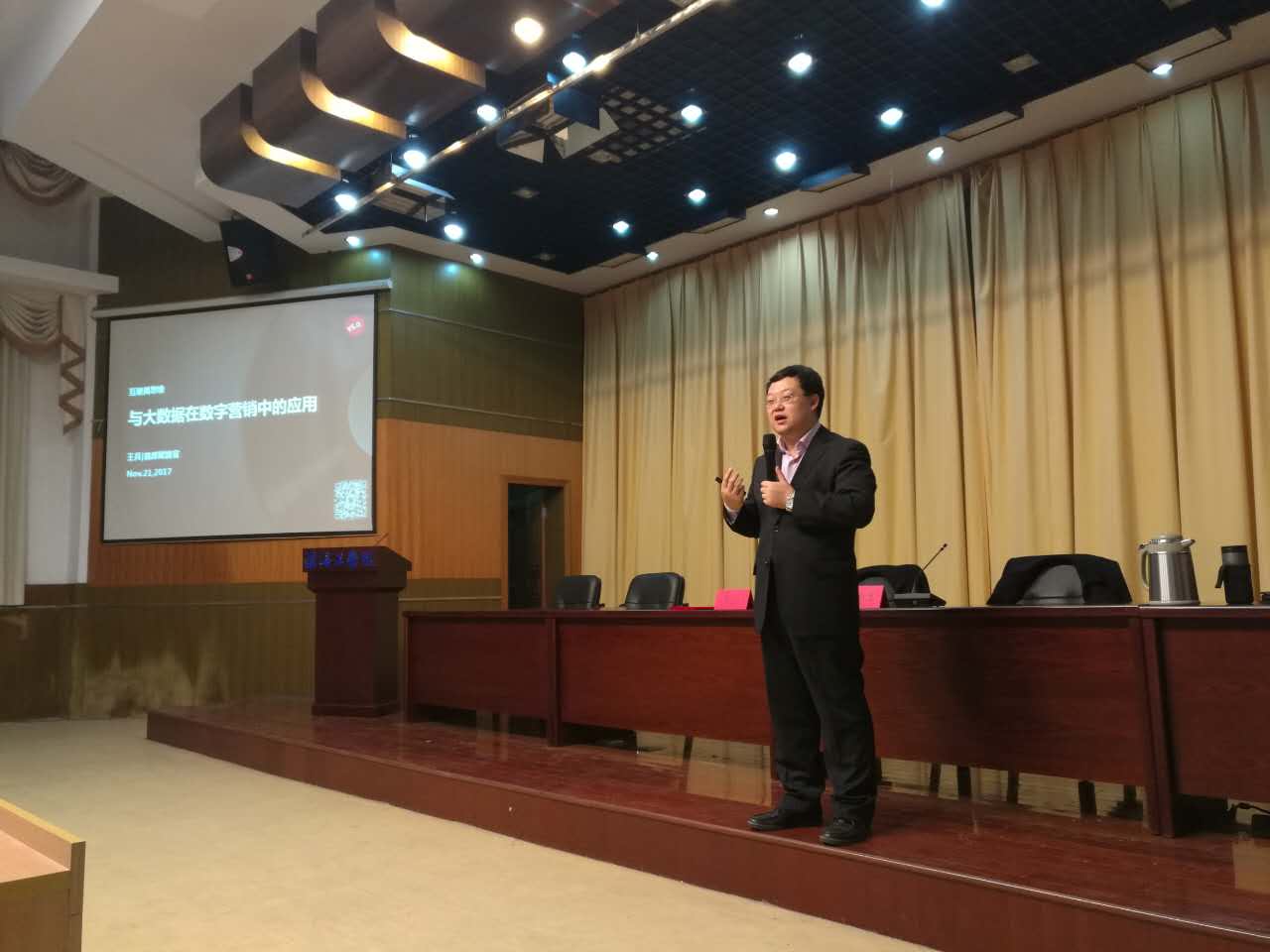 在当晚的讲坛上,王兵从“近与快”“无边界分享”“人本与入口”“场景内容”和“流量等于硬通货”等五个方面,就“互联网思维与大数据在数字营销中的应用”展开讲解,生动讲解了数字营销策略。他认为,互联网思维的核心是分享,互联网如同空气一般,具有很强的分享性;大数 据实际上是各种行为记录及其应用的结果。他通过自己曾经策划服务过的九阳豆浆、恒大冰泉、Xbed酒店等生动案例,强调数字营销必须具备互联网思维,并且充分利用大数据,提高文案书写能力和技术表现能力。讲坛内容前沿前卫,案例丰富,信息量大,互动性强,深受与会师生的欢迎。当天下午,王兵还在通灌校区以《营销人的修炼》为题,与广告系新生进行交流,分享了他的成长经历。