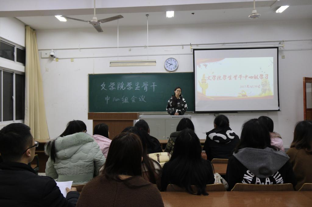 文学院本学期学生骨干中心组学习3月30日晚在在文通楼504教室举行第一次学习交流会议。文学院团委负责人孙嘉尉、文学院团学组织负责人以及从属文学院下属社团负责人参加本次学习交流会。