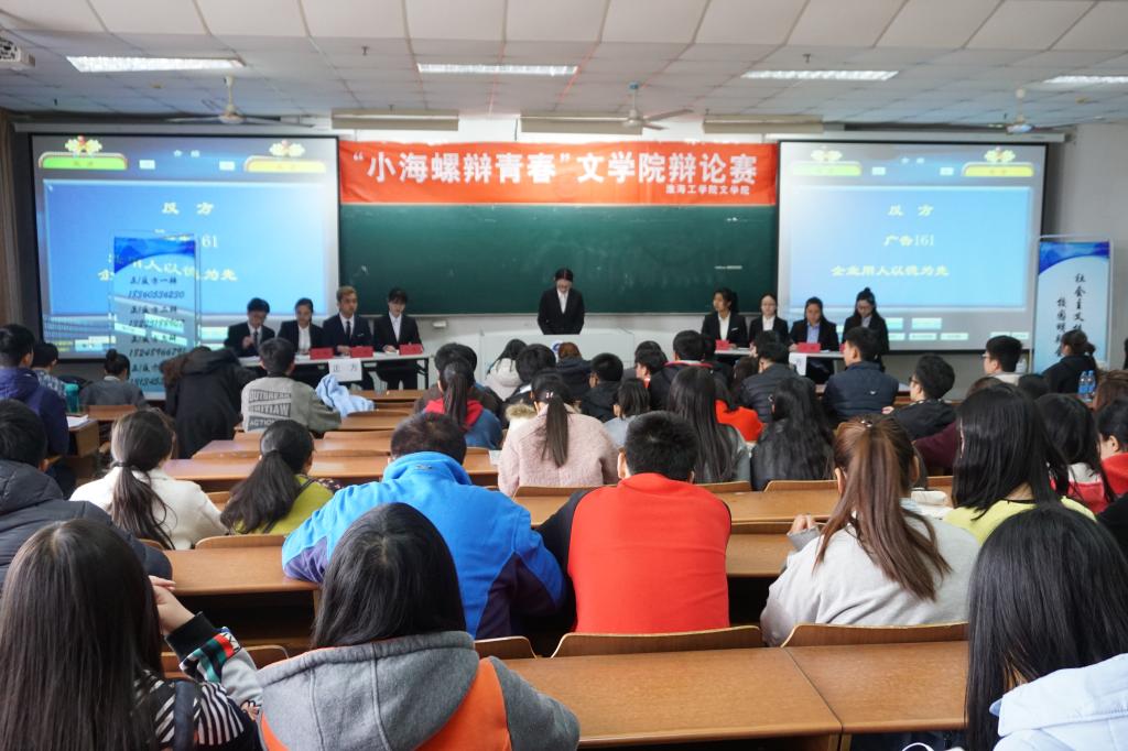 3月26日下午2时,文学院学生会在通灌校区tz102举办了“小海螺辩青春·慎思明辨行为先”社会主义核心价值观专场辩论赛。比赛双方分别是新闻161班代表队和广告161班代表队。出席本次辩论赛的评委分别是海洋生命与水产学院辩论队队长朱静迪,商学院辩论队领队段志迪,测绘与海洋信息学院辩论队队长凡寅兰,电子工程学院辩论队领队孙兰心,文学院辩论队副队长卞紫荆。