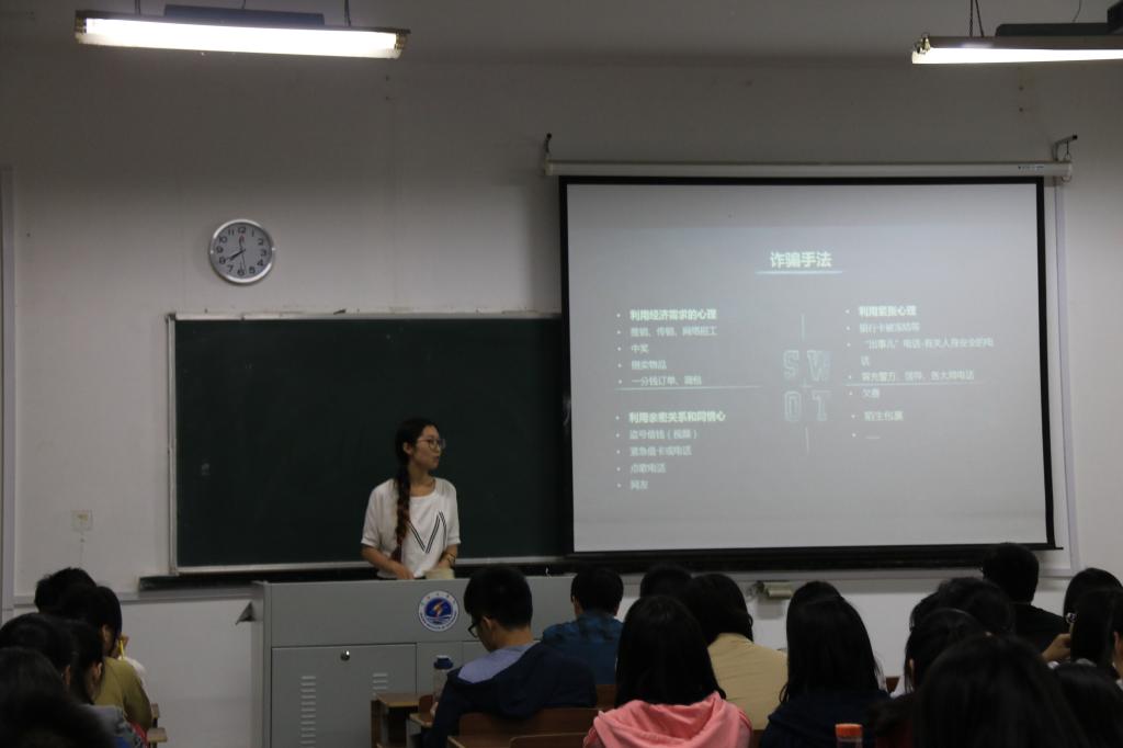 本报讯 5月12日晚7:30,为了进一步提高大学生的防诈防骗意识,保证学生人身财产安全,文学院辅导员孙嘉尉老师在通灌校区举办了以大学生防诈骗为主题的会议。