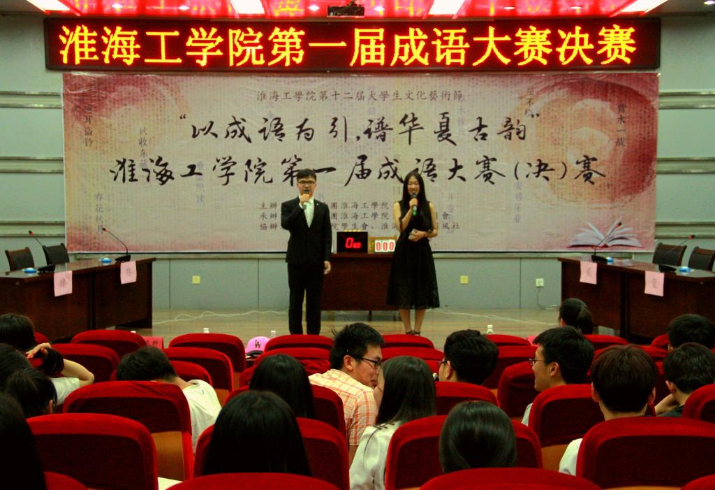 5月11日晚,由文学院承办的第十二届大学生文化艺术节之淮海工学院首届成语大赛决赛在苍梧校区艺术楼报告厅拉开帷幕。担任比赛点评嘉宾的是文学院最受学生喜爱之一的邱立楠老师,出席比赛的嘉宾有苍梧晚报席毅行记者,机械工程学院团委副书记王刚老师,测绘工程学院团委副书记周小晓老师,计算机学院团委副书记杜捷老师,文学院团委副书记李思雨老师,文学院辅导员孙嘉尉老师以及来自各二级学院团委学生副书记和学生会主席团成员。