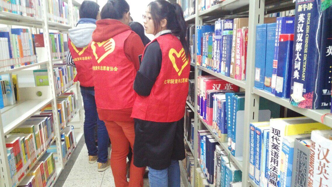 他们一路宣传,一路走向图书馆。在开始整理图书之前,副会长卢粉琴依次轻声地向参加此次活动的成员们介绍了图书整理的方法以及要求,“按顺序摆放,声音轻一点,不要打扰自习的同学们……”成员们听完副会长的介绍后,迅速地分好组,一人负责一个书架,有条不紊地整理了起来。整理书籍时,志愿者们仔细地校对每一本书,不放过任何一本被放错位置的书。虽然被放错位置的书很多,但大家还是耐心地一本一本的认真整理着。经过大家一下午的共同努力,图书馆里被放错位置的图书基本上都被还原完毕。整理图书结束后,志愿者们与来时一样,又安静有序地退出了图书馆。