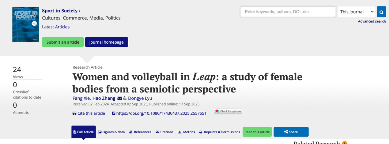 近日,我校文法学院解芳博士(第一作者)论文“Women and volleyball inLeap: a study of female bodies from a semiotic perspective”(电影《夺冠》中的女性与排球运动:一项女性身体的符号学研究)发表于社会学领域国际权威SSCI期刊《Sport in Society》。