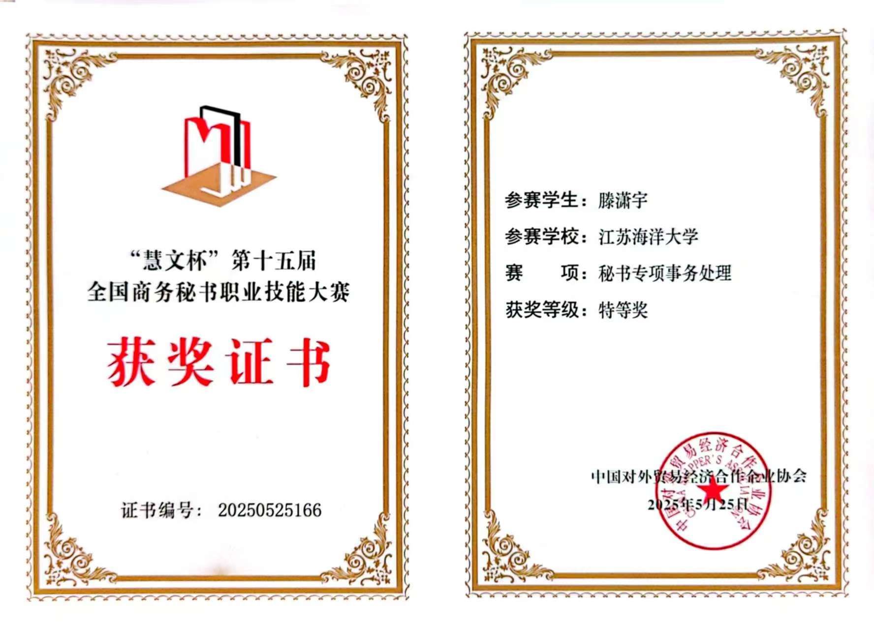 2025年5月23日至25日,“慧文杯”第十五届全国商务秘书职业技能大赛在云南曲靖盛大举行。我院学子获得团体一等奖,在个人事务处理中四人获奖,其中特等奖、一等奖各一项,并且首次获得“十佳秘书”称号。