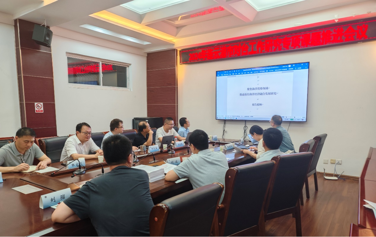2024年9月9日上午,连云港市对台工作研究专项课题推进会议在我校苍梧校区文渊楼216会议室召开,参加会议人员有连云港市台办宣调处处长刘波、经济处处长曹春峰、宣调处主任张德红、文法学院党委书记、市台湾研究中心主任魏范青、市台湾研究中心秘书长孙端以及市台湾研究中心研究人员张宏远副教授、吴建国副教授、郭高晶副教授、高锐副教授、刘骝副教授、张亚男副教授、徐亦唐副教授等各位专项课题负责人参加会议。会议有市台湾研究中心秘书长孙端副教授主持。