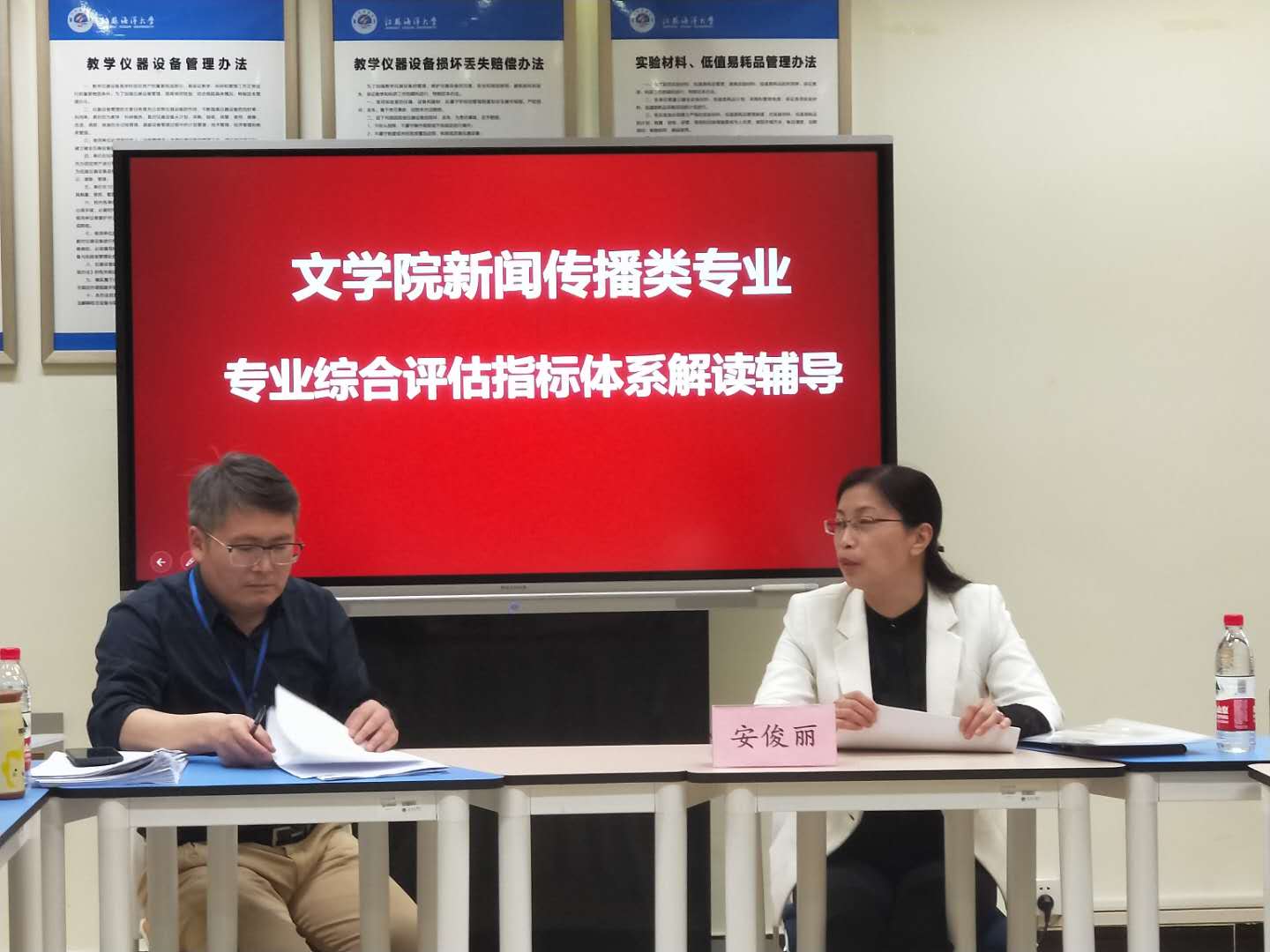 辅导会上,安俊丽处长结合我校近两年迎评情况和学校近期进行的校级专业评估工作,对江苏省专业指标体系6个一级指标、14个二级指标、26个观测点逐一进行了详细解释,明确指出了评估重点和材料准备注意事项。她对文学院中文专业在校级专业综合评估过程中所作出的努力表示感谢,充分肯定了新闻学和广告学两个本科专业在专业建设和发展中取得的突出成绩,同时就加强专业教师科研工作等提出了重要建议。李华科长作了补充说明。与会教师就其中部分指标的内涵理解向安俊丽处长进行了询问。