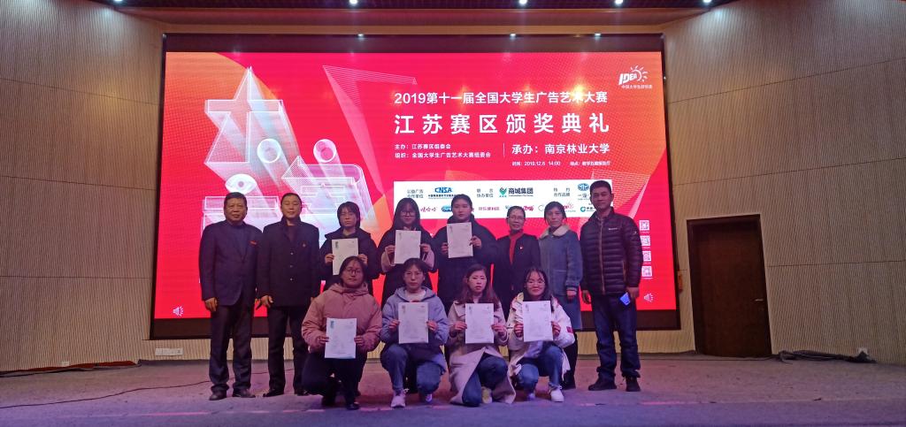 2019年12月6日下午,中国第11届全国大学生广告艺术大赛江苏赛区颁奖典礼在南京林业大学隆重召开。我校文学院党委书记马建新、艺术学院院长申屠留芳受邀作为嘉宾出席。