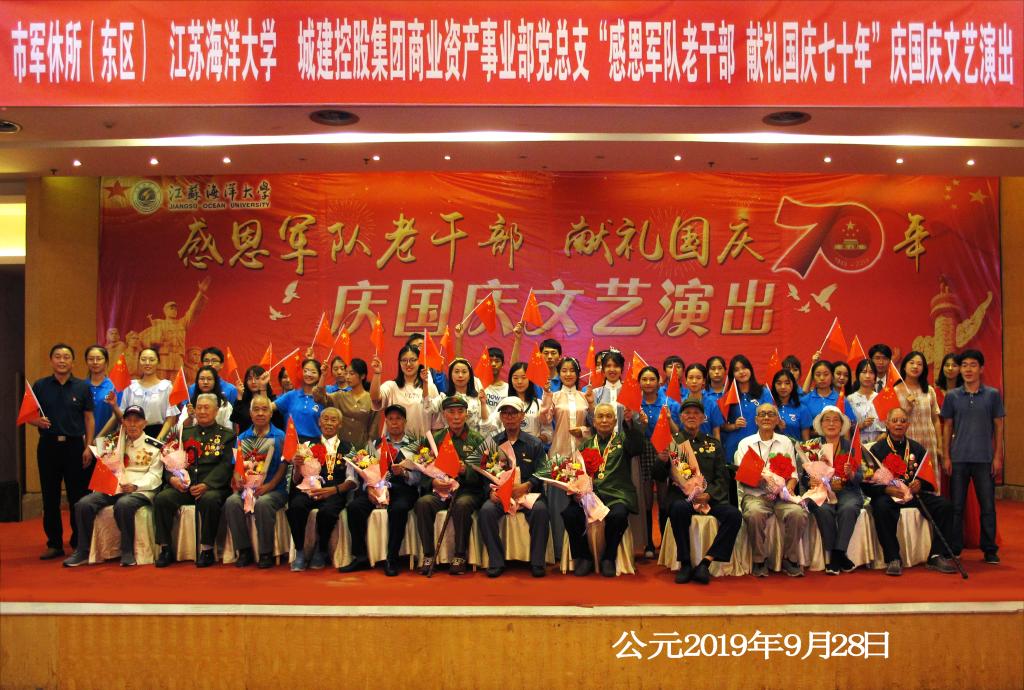 9月28日下午,由江苏海洋大学文学院、连云港市军队离退休干部休养所、中共连云区委老干部局、中共城建控股集团商业资产事业部党总支于蔚蓝海岸国际大酒店联合举办“感恩军队老干部,献礼国庆七十年”庆国庆活动。