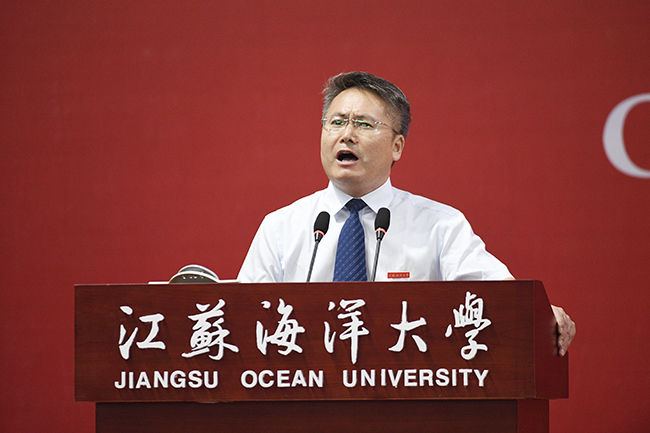我是江苏海洋大学文学院院长吴明忠,非常高兴、也非常激动参加学校更名以后的首次开学典礼,与大家共同见证江苏海洋大学开山弟子的成功启航。首先,我代表全校1500多名教师,向各位新同学,表示热忱的欢迎和衷心的祝贺,祝贺你们鱼跃龙门,汇聚江海!