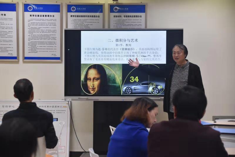 谭飞老师在授课过程中,从微积分发散开去,讲到了微积分在绘画、雕塑、工业设计、人体生物规律和文学作品中的应用,又收拢回来解析微积分理论和原理。在一个多小时的公开课中,谭老师激情飞扬、收放自如、深入浅出、思路明晰、表达流畅,表现出深厚的功底、精妙的授课艺术以及高超的课堂驾驭能力,受到了文学院教师的一致好评。课后老师们还跟谭老师进行了深入的交流和探讨。