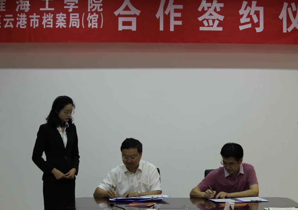 本次仪式主持人市档案局副调研员葛新成介绍了签约仪式的议程,拉开了仪式的序幕。之后,王局长和宁校长分别致辞。王局长代表全体职员对宁校长一行的到来表示热烈欢迎和衷心感谢,并向他们介绍了档案局发展历程和丰富的馆藏,希望与淮海工学院资源共享、优势互补、真诚合作,共同发展。宁校长介绍了淮海工学院发展现状及学校未来的发展规划,期望与档案局的合作能取得丰硕的成果。最后,宁校长对档案局的热情接待和大力支持表达了衷心的感谢。双方代表致辞完毕,在热烈的掌声和热切的期待中,签署了《淮海工学院与连云港市档案馆合作协议书》并为教学实习基地揭牌。