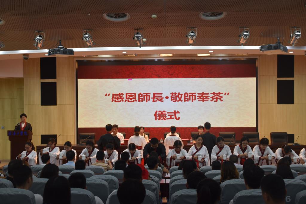 典礼在庄严的国歌声中拉开帷幕,“感谢师长,敬师奉茶”仪式在悠扬的乐曲声中展开。伴随着古朴富有韵律的奉茶词,身穿汉服的同学们手捧茶盏,从会场两侧缓缓走向台前。他们郑重的给老师递上茶盏,并深深的弯下腰行揖礼。老师们接过了学生手中的茶盏,脸上洋溢着欣慰的笑容。一举一动之间,充满了学生对师长们的敬意和感恩之情。