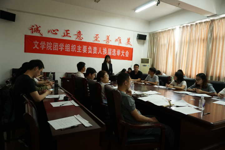 6月6日下午4时,2018年文学院团学组织负责人换届工作在苍梧校区文渊楼306举行。文学院党委副书记田德勇、辅导员张玲、吴凡、孙士生以及往届团学组织学生干部代表担任评委。