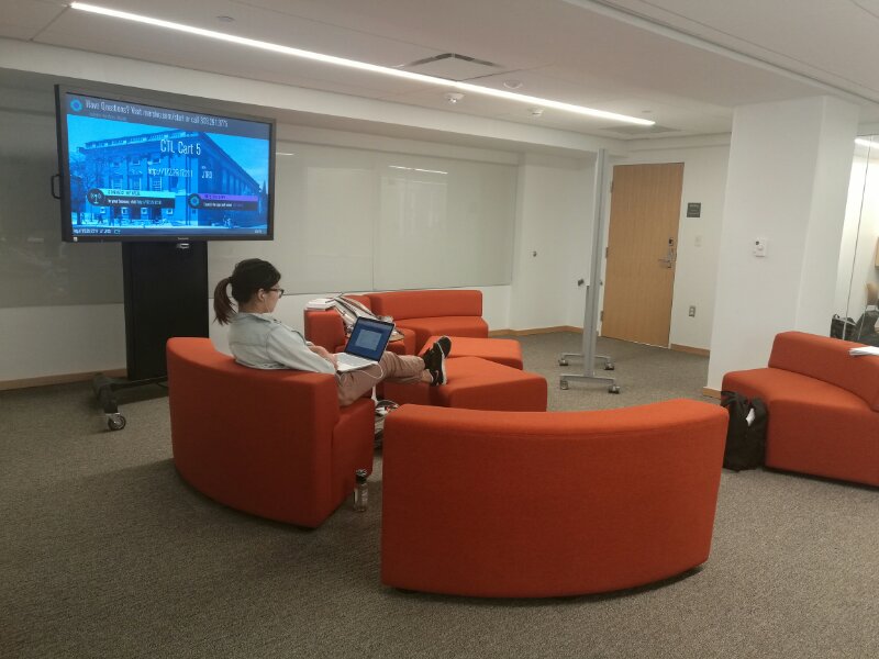 一是学生自修活动区。进门以后首先进入该区域。这一区域开放式布局,占地200多平方米,占据中心五分之一多的空间。这部分办公设备主要有:一个高度不到2米的中型可移动电子显示屏(61寸);一套橙色转圈布艺沙发;两个可移动白板;一个圆形桌子,配四把椅子;两个休闲沙发,中间放一个小型茶几;一个小长方形办公桌,配有固定电脑(无主机);一个稍大的长方形桌,配有固定电脑;一个茶吧式吧台,配有六把高脚椅;一个书桌上放一台复印打印机器。办公设备摆放按照以方便活动为宗旨,人性化安排,同时尽量节约利用空间。