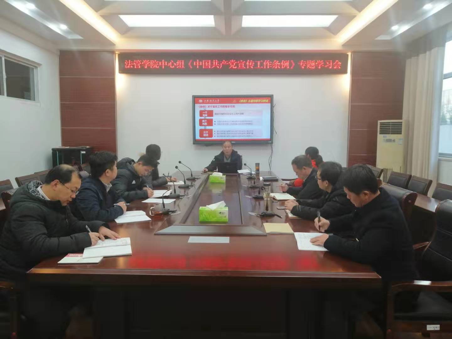 12月6日下午,我院党总支中心组在文渊楼216会议室开展下半年理论学习,专题学习《中国共产党宣传工作条例》(以下简称《条例》)。学院全体院领导、党支部书记参加,会议由院党总支书记朱国良主持。