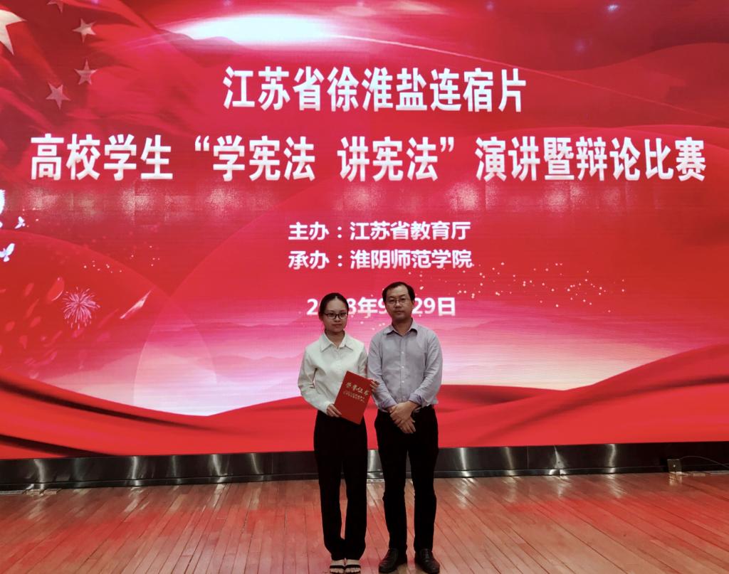 9月29日,江苏省苏北高校学生“学宪法讲宪法”演讲暨辩论比赛在淮阴师范学院举行。此次比赛由江苏省教育厅主办,淮阴师范学院承办。中国矿业大学、江苏师范大学、徐州医科大学等苏北五市13所高校的选手参加了此次比赛。法律与公共管理学院法学162班学生杨琪代表我校参加了比赛,法律与公共管理学院吴建国副教授作为指导教师带队参赛。