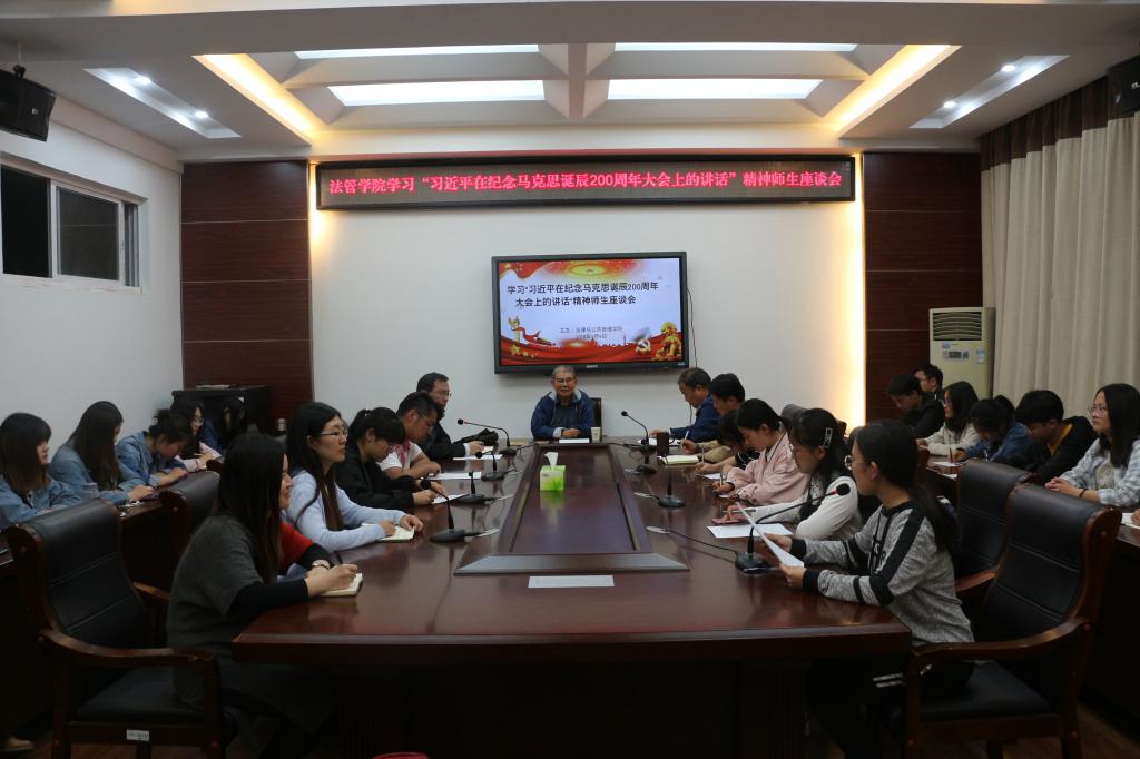 5月9日晚,法律与公共管理学院在学院会议室召开学习“习近平在纪念马克思诞辰200周年大会上的讲话”精神师生座谈会。学院邀请退休教师、学院关工委副主任张君来教授参加会议,院党总支书记朱国良,副书记、副院长黄金虎,党政办主任高勇,辅导员蒋莹莹、赵亚婷,以及学生干部代表共30多人参加了会议。座谈会由黄金虎主持。