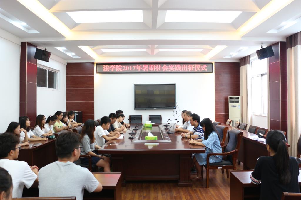 7月6日上午,法学院在文渊楼216会议室举行2017年暑期社会实践出征仪式。法学院党总支书记朱国良、党总支副书记、副院长黄金虎、辅导员蒋莹莹以及法学院四支暑期社会实践团队成员参加了本次出征仪式。