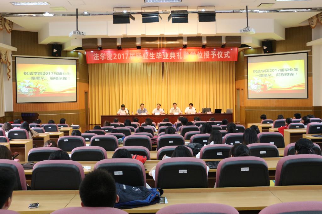 6月23日下午,法学院2017届毕业生毕业典礼暨学位授予仪式在讲堂楼报告厅隆重举行。法学院党政领导,各系主任、辅导员及毕业班班主任与全体2017届毕业生一起参加了仪式。仪式由法学院党总支副书记、副院长黄金虎主持。