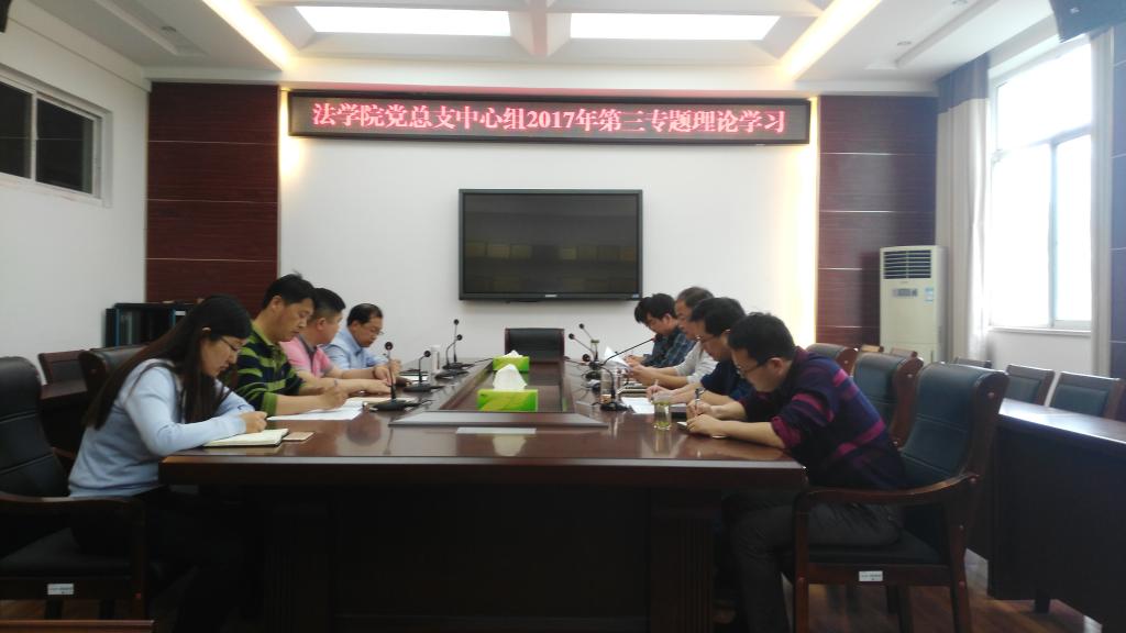 5月15日下午,法学院在文渊楼216会议室举行党总支中心组2017年第三专题理论学习,法学院全体院领导、支部书记参加,会议由法学院党总支书记朱国良主持。
