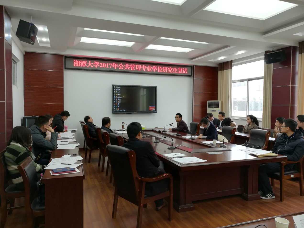 3月29日上午,湘潭大学2017年公共管理专业学位研究生复试在我校法学院顺利完成。湘潭大学公共管理学院院长盛明科教授、副院长王凯伟教授全程参加了面试。本次共有18名同学参加了英语听力、政治理论笔试及面试等环节的复试。