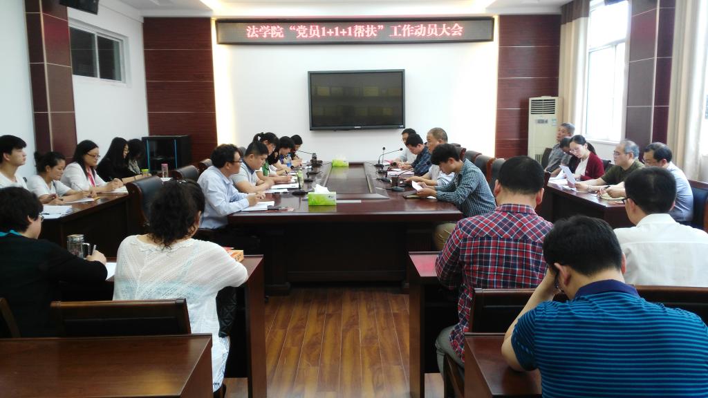 6月8日下午,法学院党委在文渊楼216会议室召开了“党员1+1+1帮扶”工作动员大会。法学院党委书记朱国良、副院长陈兴发、党委副书记、副院长黄金虎出席大会,参与帮扶工作的教工党员、学生党员、受帮扶学生代表等40多人参加,会议由黄金虎同志主持。