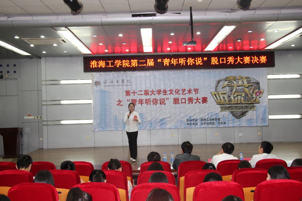 5月4日晚七时,第二届“青年听你说”脱口秀大赛决赛在苍梧校区艺术楼报告厅举行。连云港市革命纪念馆馆长白植明、法学院党委副书记、副院长黄金虎、副院长魏范青和法学院团委副书记崔家新出席大赛,并担任评委,10名晋级决赛的选手进行了最后的角逐。
