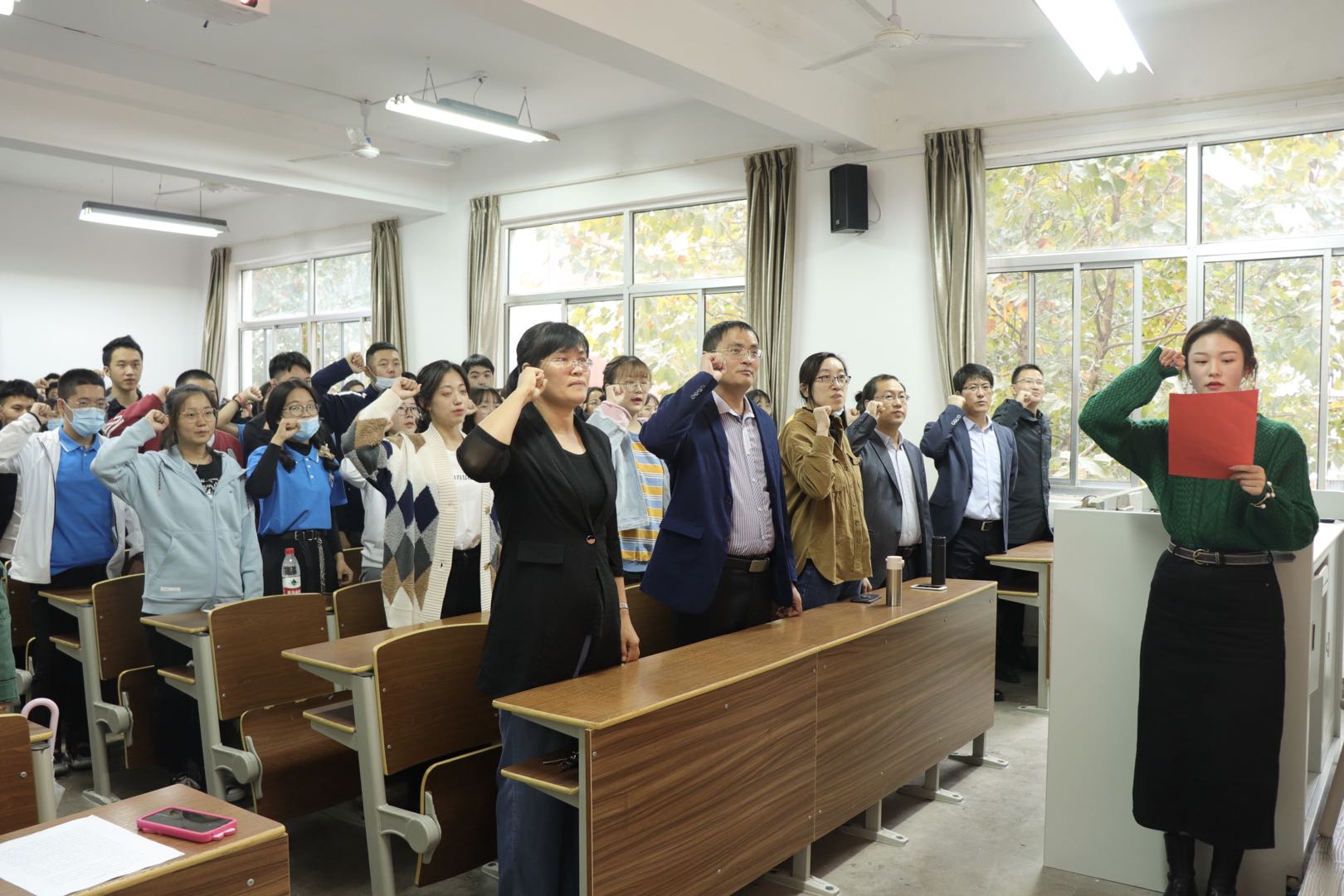 会议第二阶段是法学专业新生入学宣誓仪式。由老生代表刘洁如同学领誓,全体新生面向国旗、举起右拳,庄严宣誓:“我决心忠于宪法和法律,认真学习法律知识,增强法治理念,坚守公平正义,维护法律尊严……”。新生们的宣誓声响彻整个教学楼,每一句誓言都振聋发聩,这一刻,对于所有法律人和在场的每一位新生而言都无比神圣。