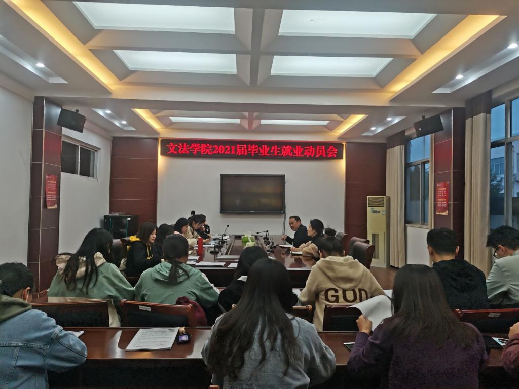 10月15日下午,文法学院在文渊楼216会议室召开2021届毕业生就业动员会。学院党委副书记王国银、辅导员赵亚婷以及全体毕业班班委参加会议。