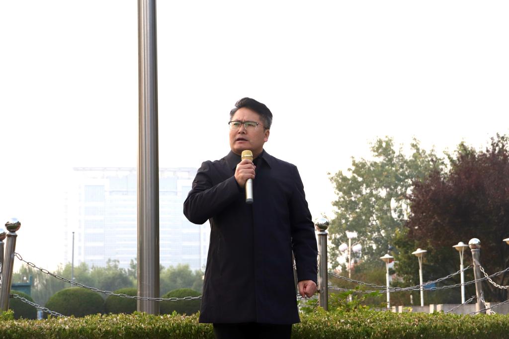 接着,吴明忠发表讲话。他说,本次活动不仅是文法学院的第一次升旗仪式,也是文法学院组建以来举行的首次老生大型全体活动,面对此情此景,吴院长十分感慨。他高度赞扬了文法学院组建以来取得的傲人成绩,“青年博士许胜晴国际期刊发论文,毕业生王海洋先进事迹上了学习强国,青年博士滕汉洋喜获国家社科基金,第一届寻哲杯案例大赛特等奖,社会实践两个团队校内十佳。学习强国平台,短视频一举获得三等奖;全国国家贷款征文,江苏九篇,海大有其一。”一份又一份令人赞叹的成就,一个又一个令人振奋的好消息,所有使人艳羡的背后都是文法学院老师与学子的拼搏与努力。吴院长指出:“身在一方,你不能偏安一隅,而要放眼世界,前要见古人,后要见来者。”他希望文法学院的每一个学生都憧憬着未来,努力学习,超越自我,向着更高更好的目标不断追求。