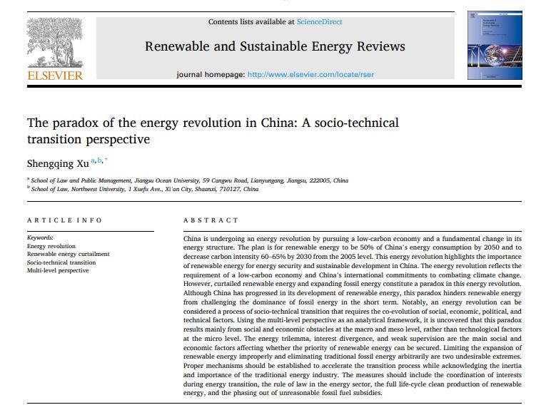 10月21日,我院法学系许胜晴博士独著论文“The paradox of the energy revolution in China: A socio-technical transition perspective”发表于国际能源领域顶级期刊《Renewable and Sustainable Energy Reviews》。论文运用多层次分析理论,揭示了我国能源转型过程中各类因素的复杂互动规律,对我国能源转型过程及其制度控制进行了创新性研究。