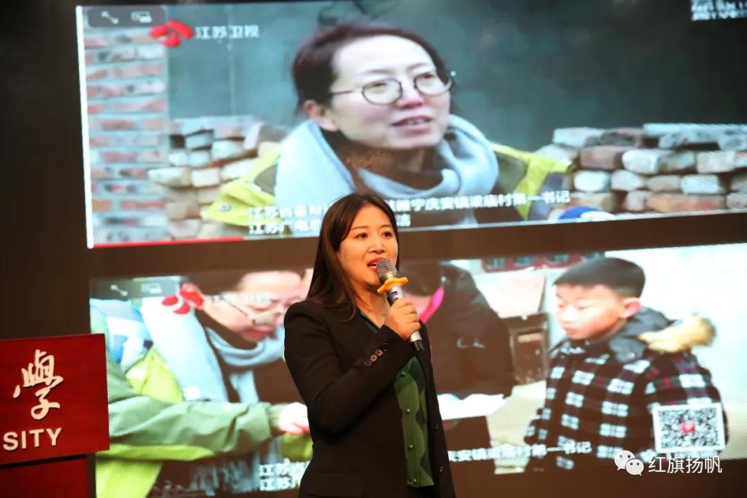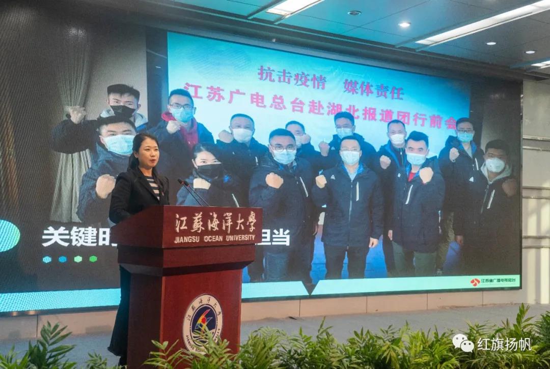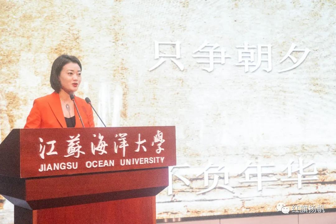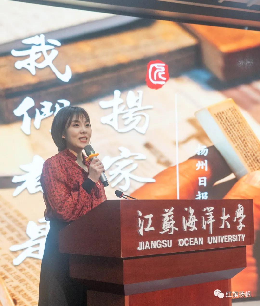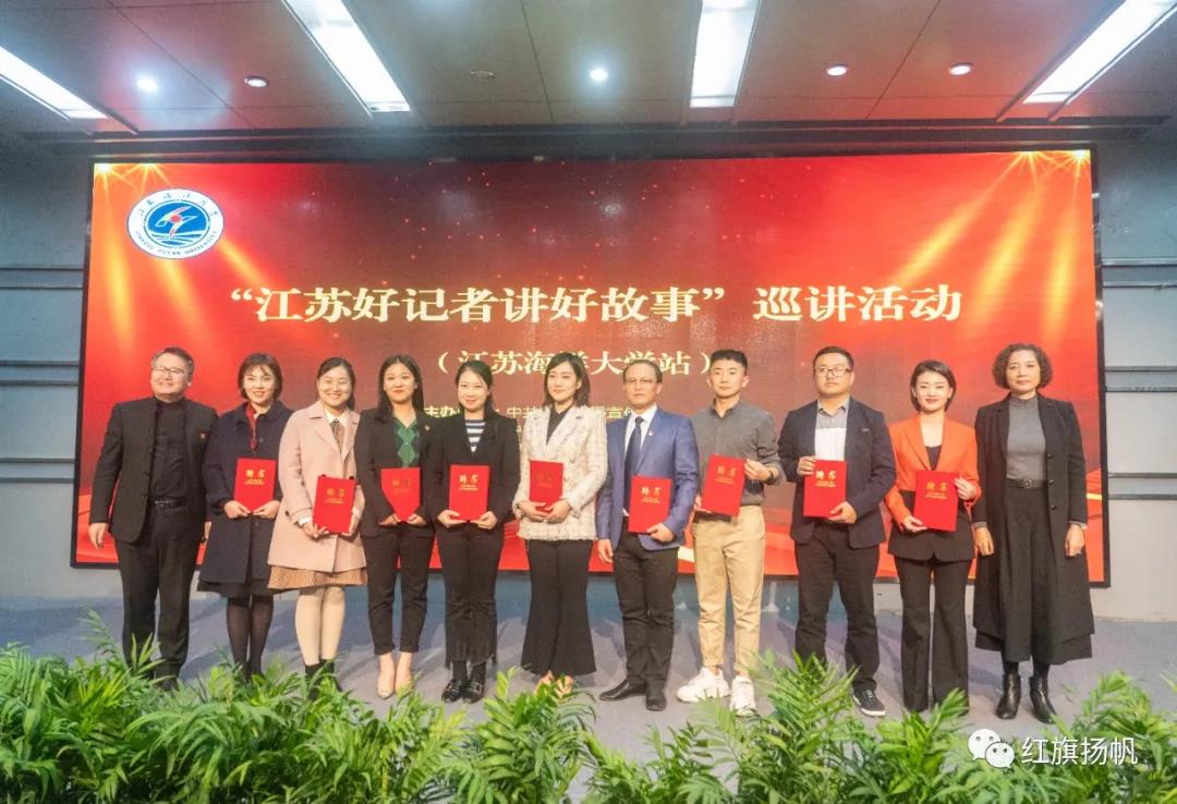 当天下午,江苏海洋大学艺术楼报告厅门外,一长条红地毯直抵会场,一盆盆红绿相映的鲜花、一整屏深红的“江苏好记者讲好故事巡讲活动”主题背景墙,把主席台装扮得喜庆热烈。