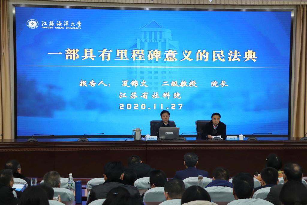 11月27日上午,文法学院特邀江苏省社会科学院党委书记、院长夏锦文教授在我校会议中心黄海厅为文法学院广大师生做了一场以“一部具有里程碑意义的民法典”为题的精彩讲座。讲座由文法学院党委书记吴价宝教授主持,文法学院法学系师生现场聆听了讲座。