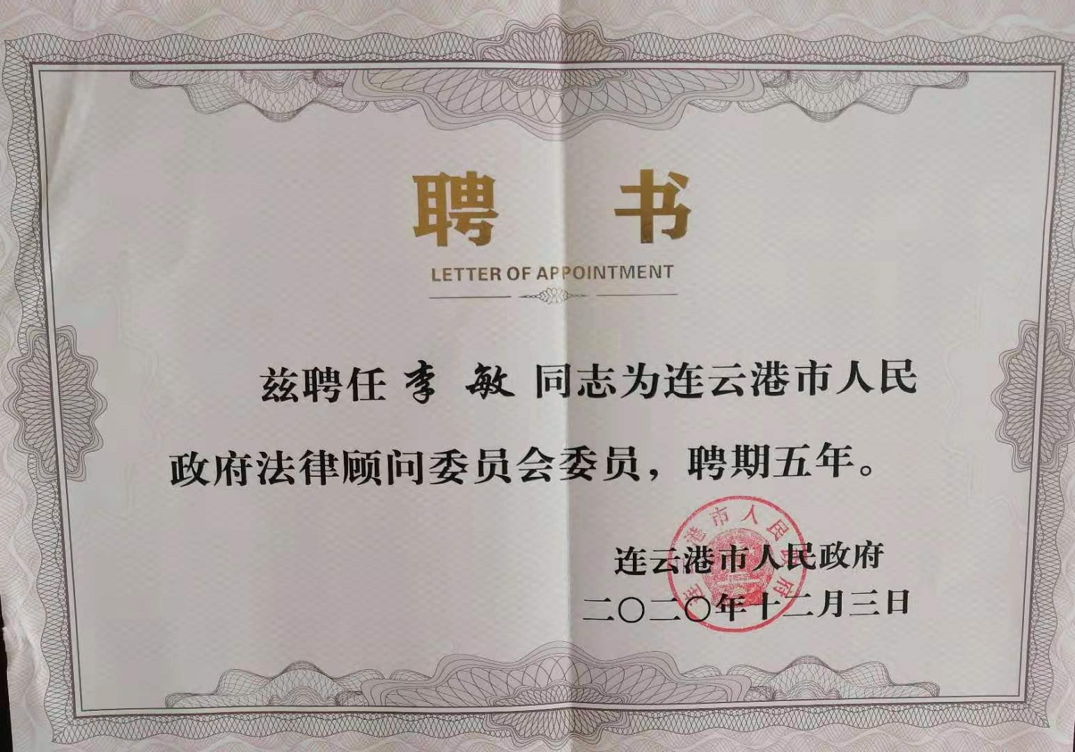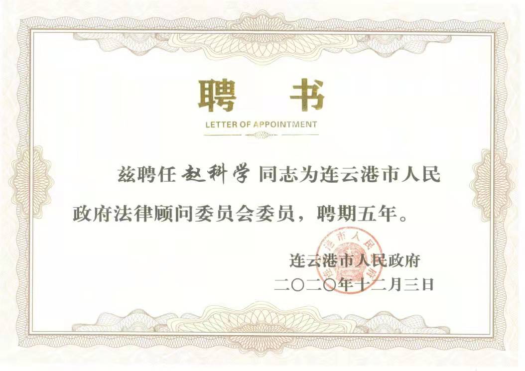 12月22日下午,连云港市人民政府在市政府大楼433会议室举行政府法律顾问聘任仪式。文法学院副院长李敏副教授、法学系赵科学副教授获聘,聘期五年。连云港市政府副市长徐敦虎为获聘的法律顾问颁发聘书并作了重要讲话,赵科学老师作为法律顾问代表之一作了发言表态。