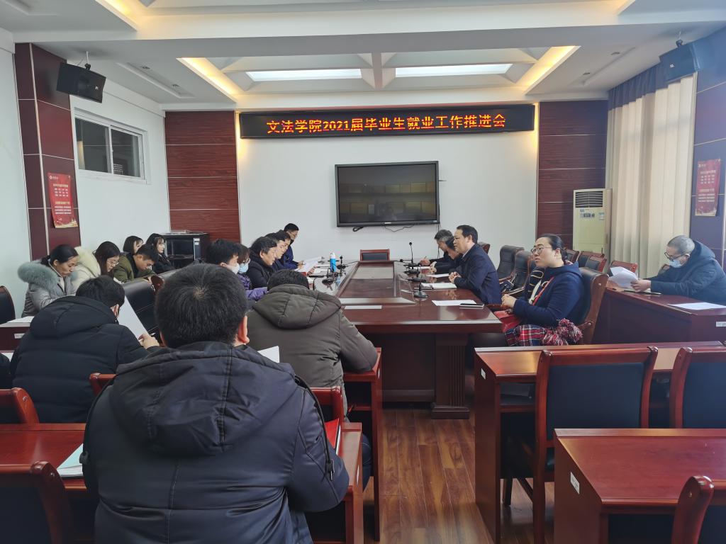 1月19日下午,文法学院召开2021届毕业生就业工作推进会,研究部署相关工作。学院党委书记吴价宝、院长吴明忠、副院长李敏、各系正副主任、支部书记、2021届毕业班班主任和全体辅导员参加会议,会议由院党委副书记王国银主持。
