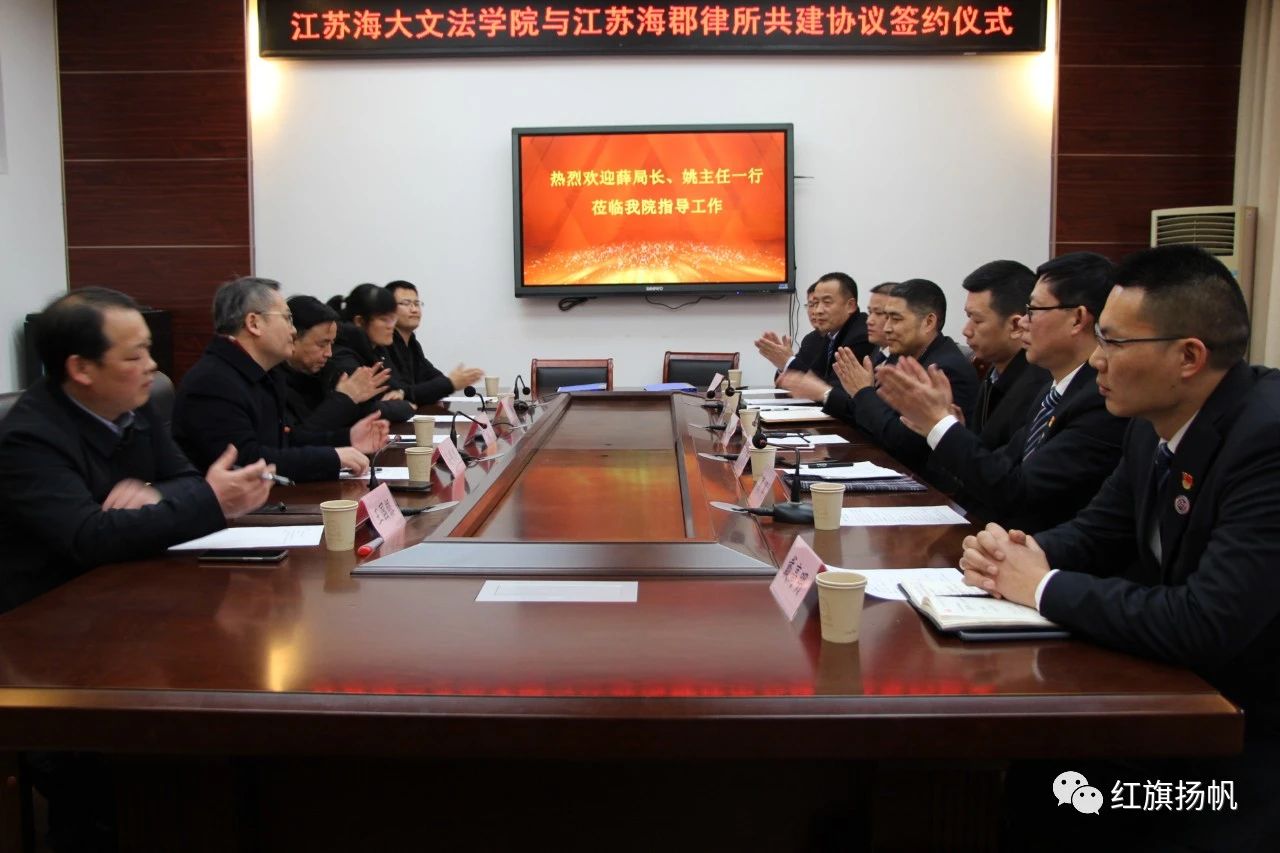 1月16日下午,文法学院和江苏海郡律师事务所合作共建协议仪式在文渊楼216会议室举行,连云港市司法局副局长、市律师行业党委书记薛玉江、江苏海郡律师事务所主任姚德波等和文法学院领导班子成员及部分教师代出席签约仪式。签约仪式由李敏副院长主持。