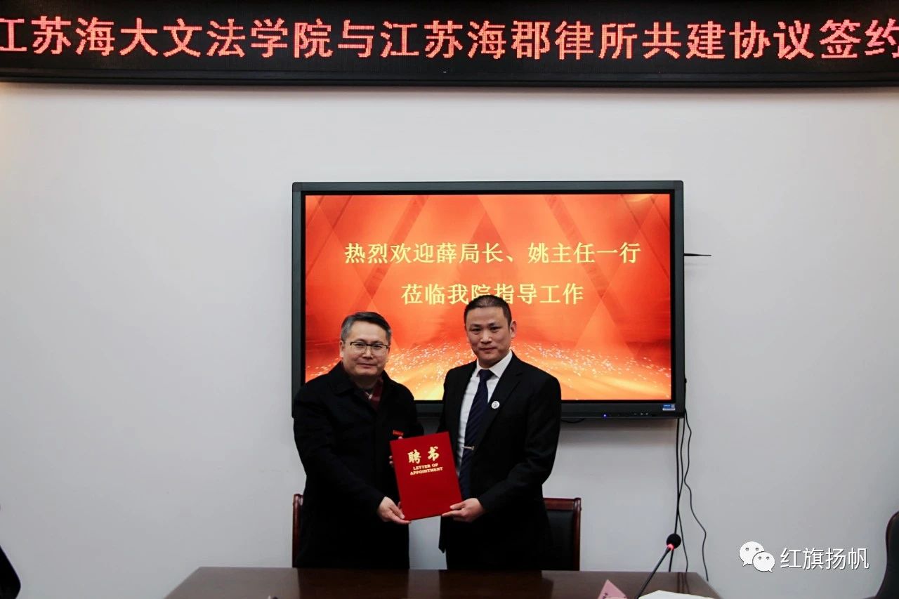 会议期间,吴明忠院长和姚德波主任分别代表院所双方签订《江苏海洋大学文法学院和江苏海郡律师事务所共建活动协议》《江苏海郡律师事务所在江苏海洋大学文法学院设立海郡奖学金协议》,并为双方受聘人员颁发聘书。